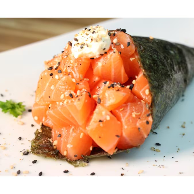 Temaki em forma de cone, recheado com cubos de salmão fresco, cream cheese e arroz, finalizado com gergelim. Serve 200g.