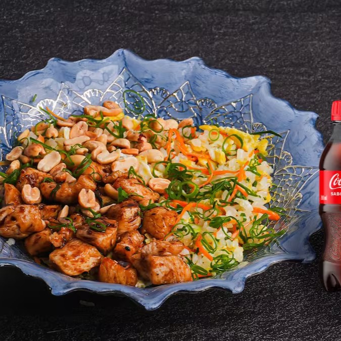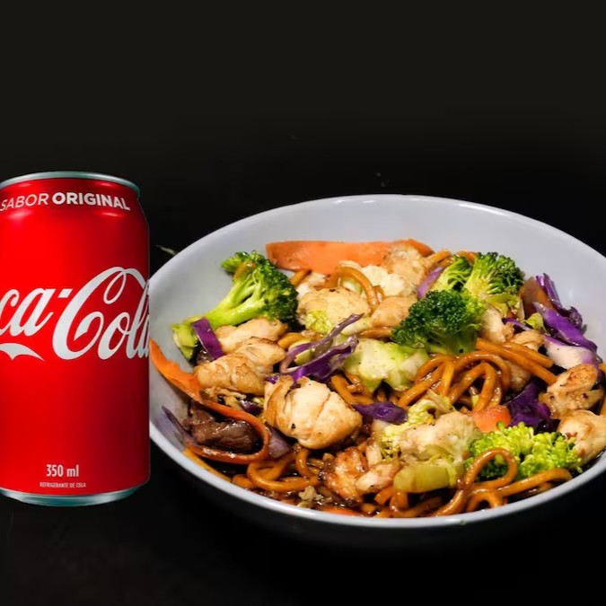 Yakissoba Tradicional: macarrão oriental com carne, frango e legumes frescos e salteados (acelga, brócolis, cenoura, couve-flor, repolho verde e roxo), finalizado com molho especial. Para completar, acompanha 1 Coca-Cola Original 350ml.