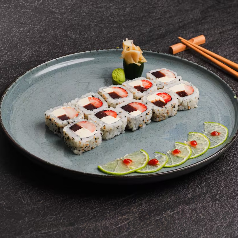 Sushis empanados na massa harumaki e quentinho, recheado com brigadeiro artesanal. Cobertura de chocolate branco e morango fresco.