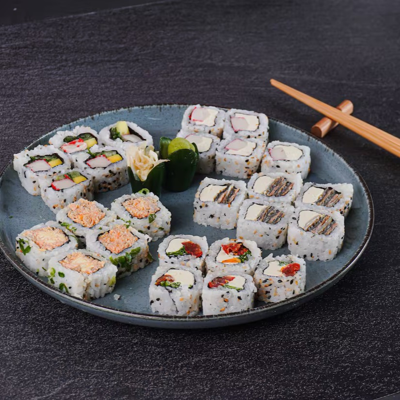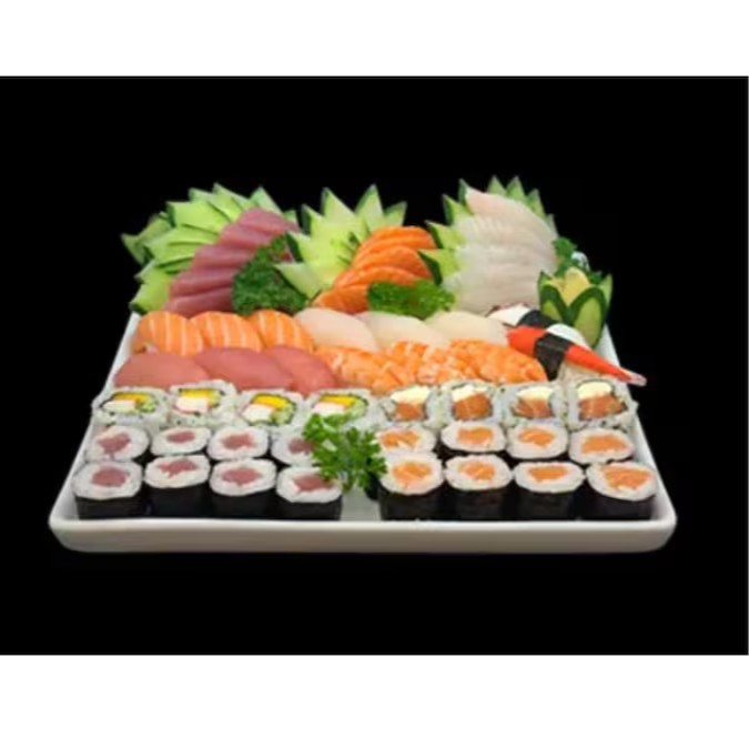 Um combinado irresistível de 4 sashimi de salmão, 4 sashimi de atum, 4 sashimi de tilápia, 5 uramaki filadelfia, 5 uramaki atum, 4 hossomaki de salmão, 4 teka maki de atum, 2 niguiri de salmão, 2 niguiri de atum, 2 niguiri de tilápia