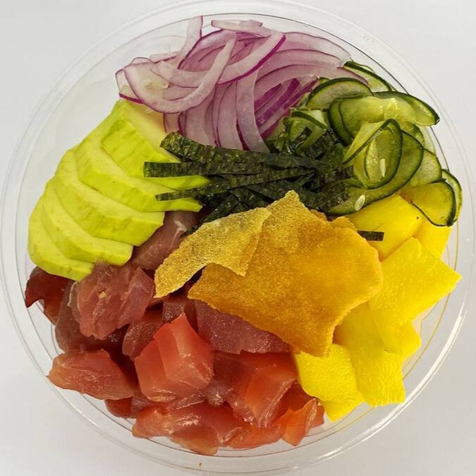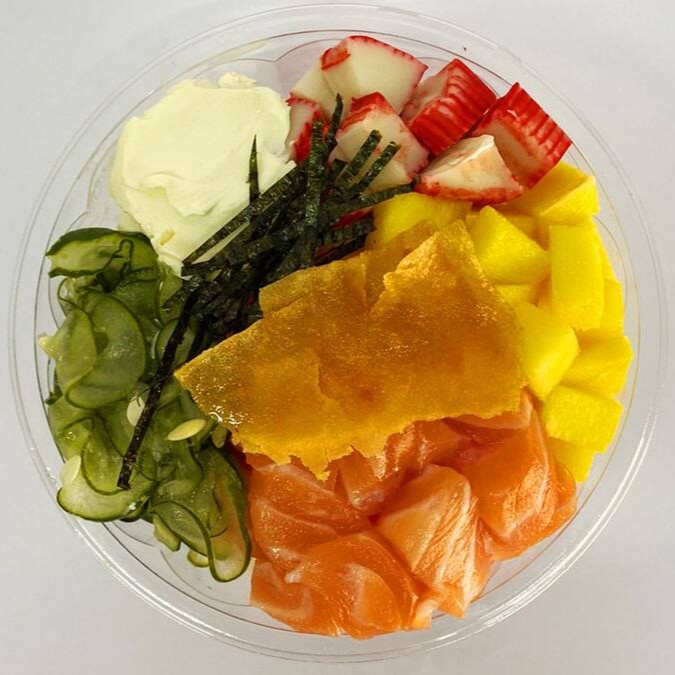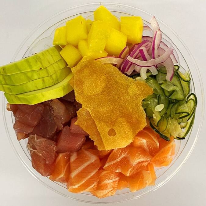 Arroz japonês, salmão suculento, atum, manga, edamame, cebola roxa, nori, sunomono e crisp de batata doce.
