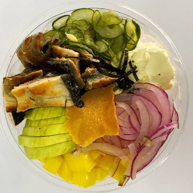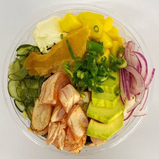 Arroz japonês, salmão grelhado suculento, manga, cebola roxa, edamame cream cheese, sunomono, cebolinha, nori e crisp de batata doce.