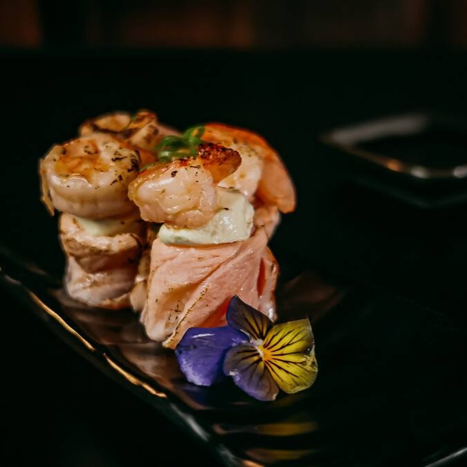 Rolinho de salmão recheado com arroz e cream cheese, coberto com camarão - 4 unidades