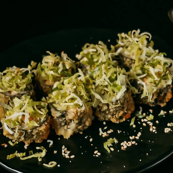 Arroz japonês, pele de salmão suculento, cream cheese, sunomono, edamame manga, cebola roxa, nori, crisp de batata doce.