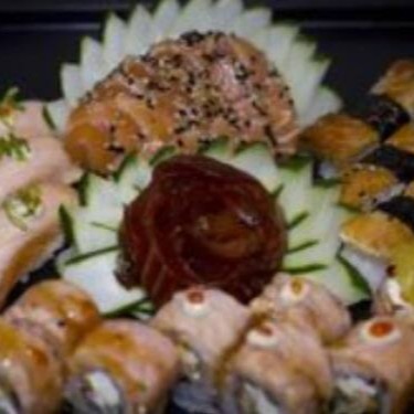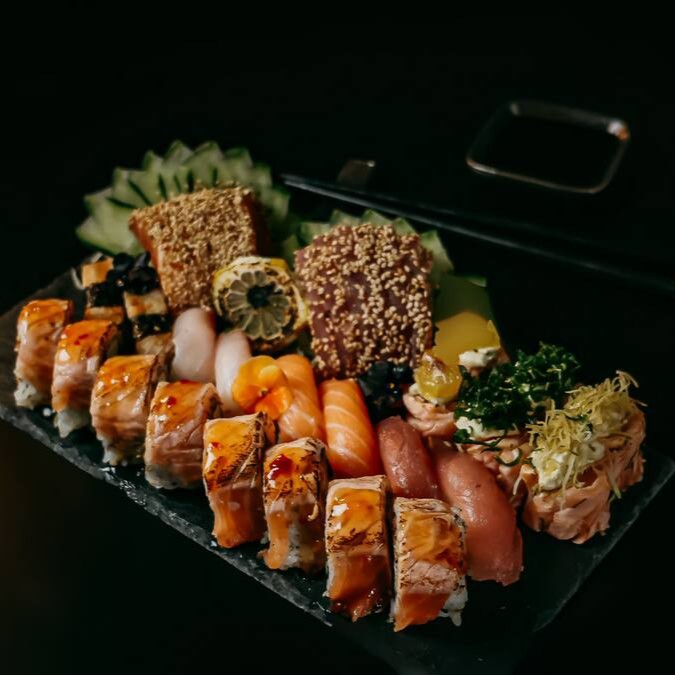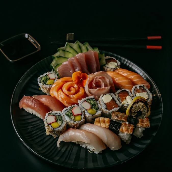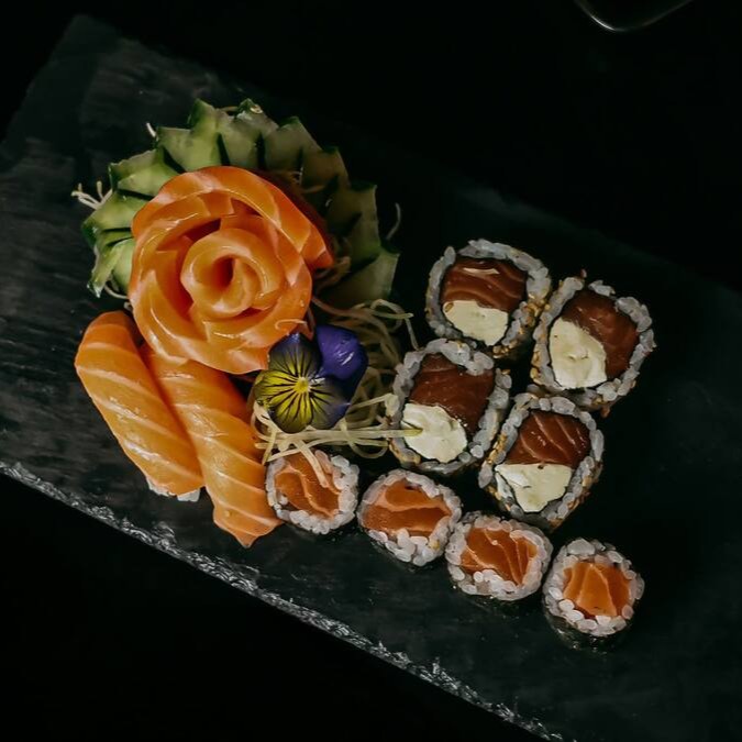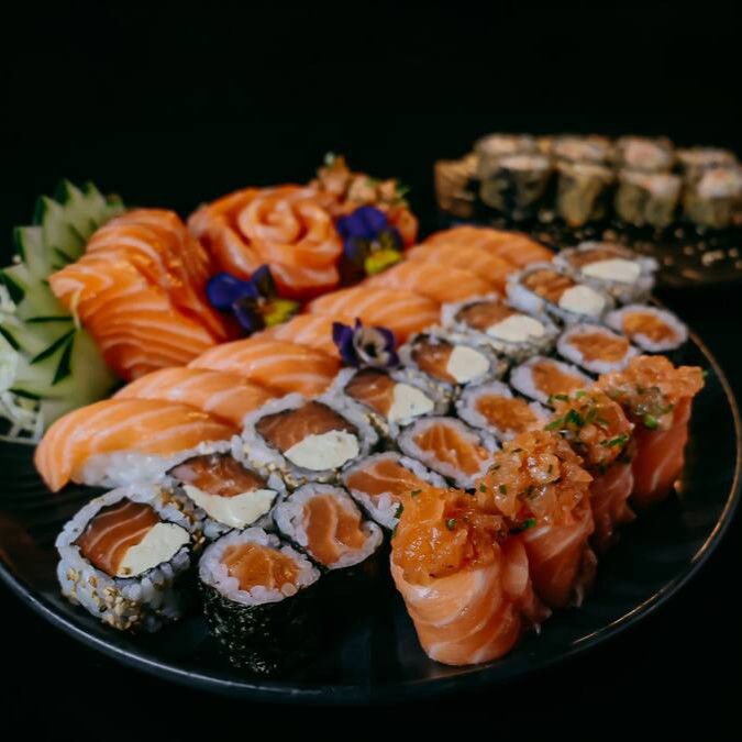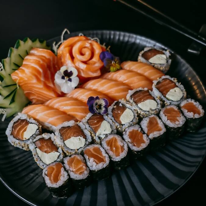 12 sashimi de salmão, 8 uramaki filadelfia, 8 shakemaki, 8 niguiri de salmão, 6 niguiri jow e 8 hot filadelfia