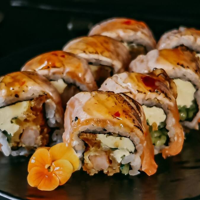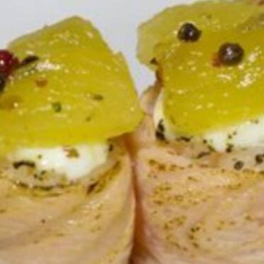 Rolinho de salmão recheado, maçaricado com arroz, cream cheese e coberto com geleia de abacaxi - 4 unidades