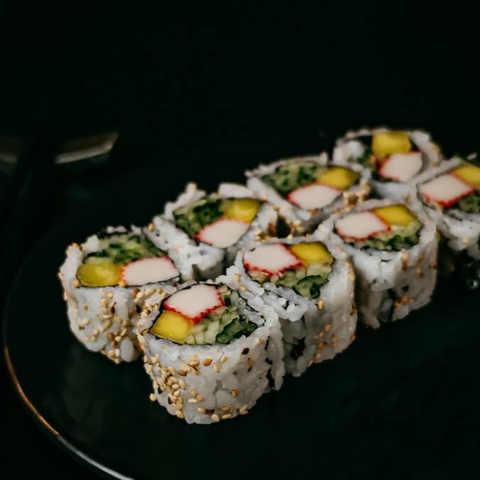 Arroz japonês, salmão suculento, manga, kani, cream cheese, nori, sunomono e crisp de batata doce