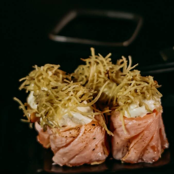 Hot Filadélfia coberta com crispy de alho poró