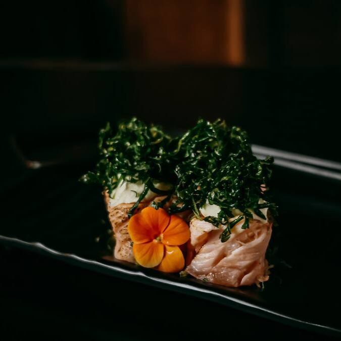 Arroz japonês, salmão suculento, manga, cebola roxa, sunomono, edamame, cream cheese, nori e crisp de alho poró.