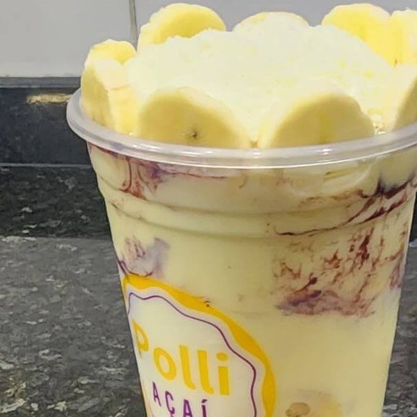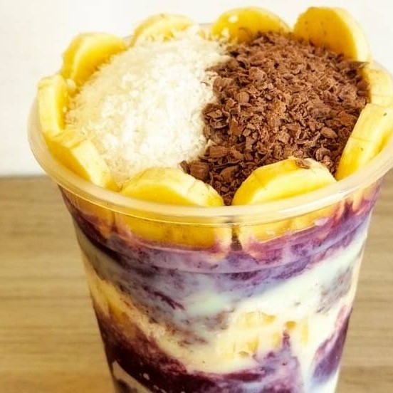 Açaí, banana, coco, chocolate ao leite, leite condensado.