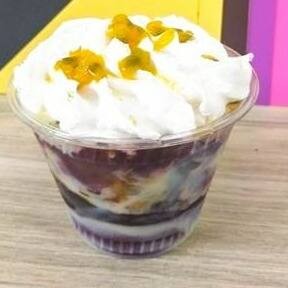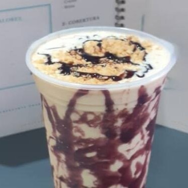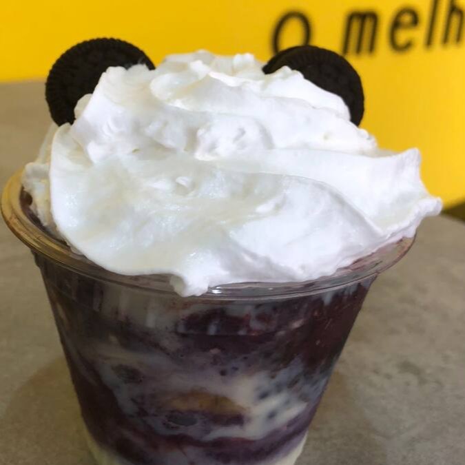 Açaí, creme de Ninho, Bis branco, Bis preto, confeti, leite condensado, chantilly.