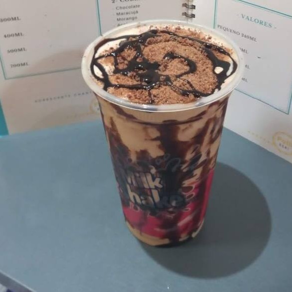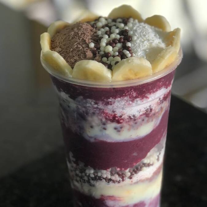 Açaí, banana, chocoball, chocolate preto (Ralado), chocolate branco (Ralado), leite condensado.