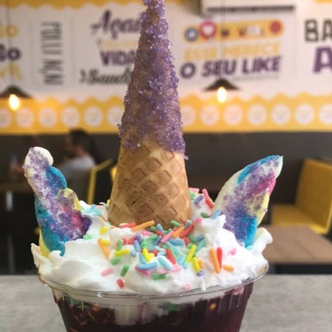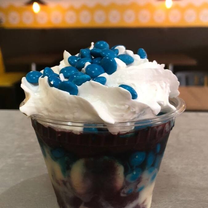 Açai, banana, Confete azul, leite condensado, calda azul. + brinde