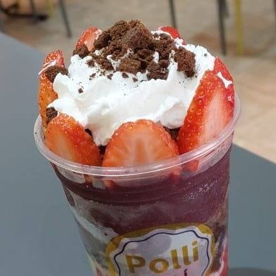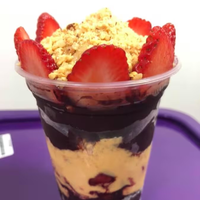 Açaí, morango, paçoca, pasta de amendoim, leite condensado.