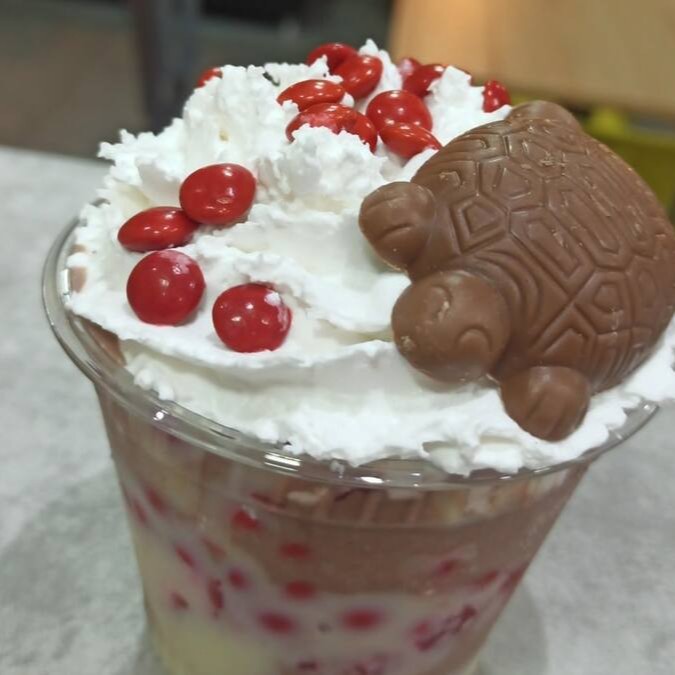 Decoração: Chantilly e 1 tartaruga de chocolate.