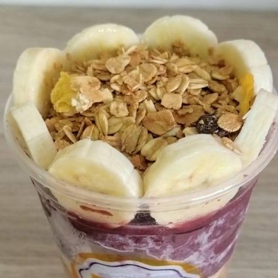 Açaí, banana, granola, leite condensado.