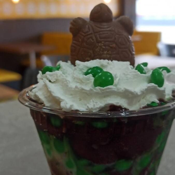 decoração: Chantilly e 1 tartaruga de chocolate.