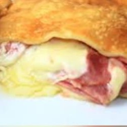 Delicioso pastel com frango desfiado, calabresa, bacon em cubos, queijo mussarela, presunto, ovo e milho.