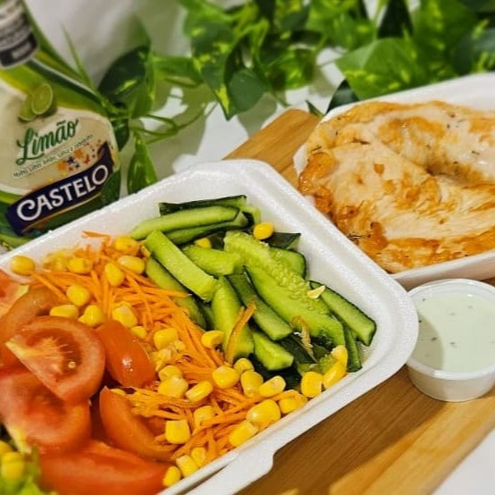 Salada completa e fresquinha, acompanha alface crespa, tomate, milho verde, pepino japones, cenoura ralada, e uma proteina de sua escolha Acompanha molho para salada.