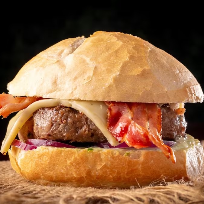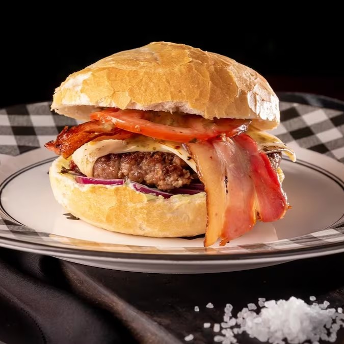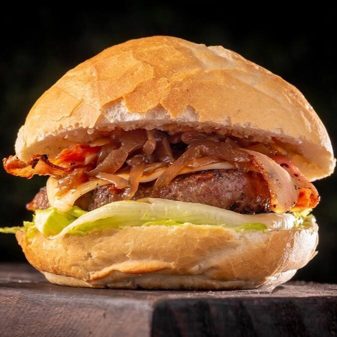 Pão, 1 Hambúrguer Angus, queijo mussarela, bacon, cebola caramelizada, alface americana e maionese da casa.