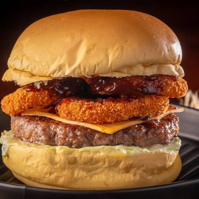 Combinação de Onion e Barbecue, Pão, 1 Hambúrguer Angus, queijo cheddar, onion rings sequinhas, molho barbecue e maionese da casa.
