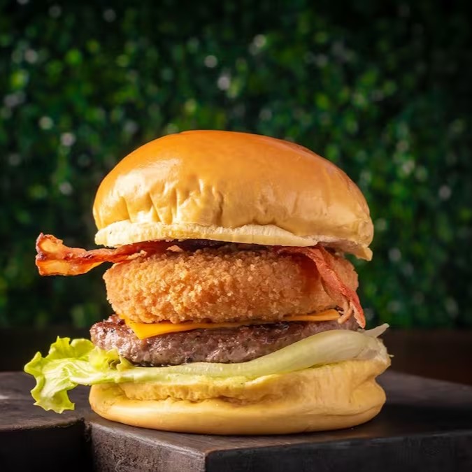 Pão, 1 Hambúrguer Angus, fatia de cheddar, queijo empanado 100g, alface americana, bacon e maionese da casa