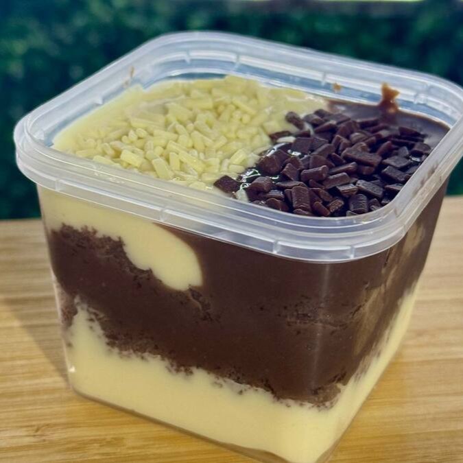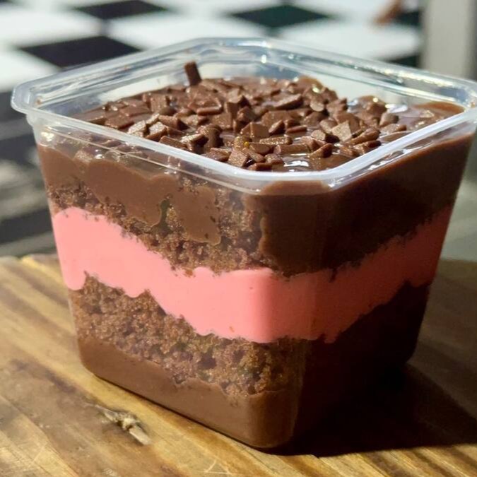 Bolo no pote dois amores. Massa de chocolate com 100% cacau, um delicioso creme 4 leites e brigadeiro.