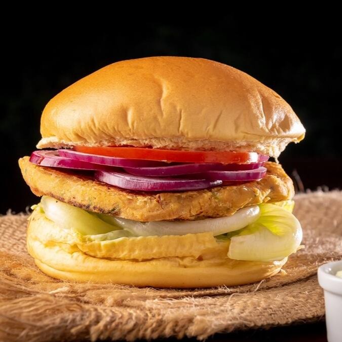 Uma explosão de sabores naturais e saudáveis. Pão, 1 Hambúrguer com grão de bico, cenoura, cheiro verde, sal e creme de cebola, alface americana, tomate, cebola roxa e maionese da casa.