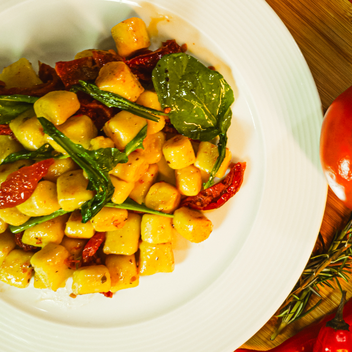 Nhoque artesanal de batata com azeite extra virgem, rúcula fresca e tomate seco. Um prato leve, aromático e cheio de personalidade.