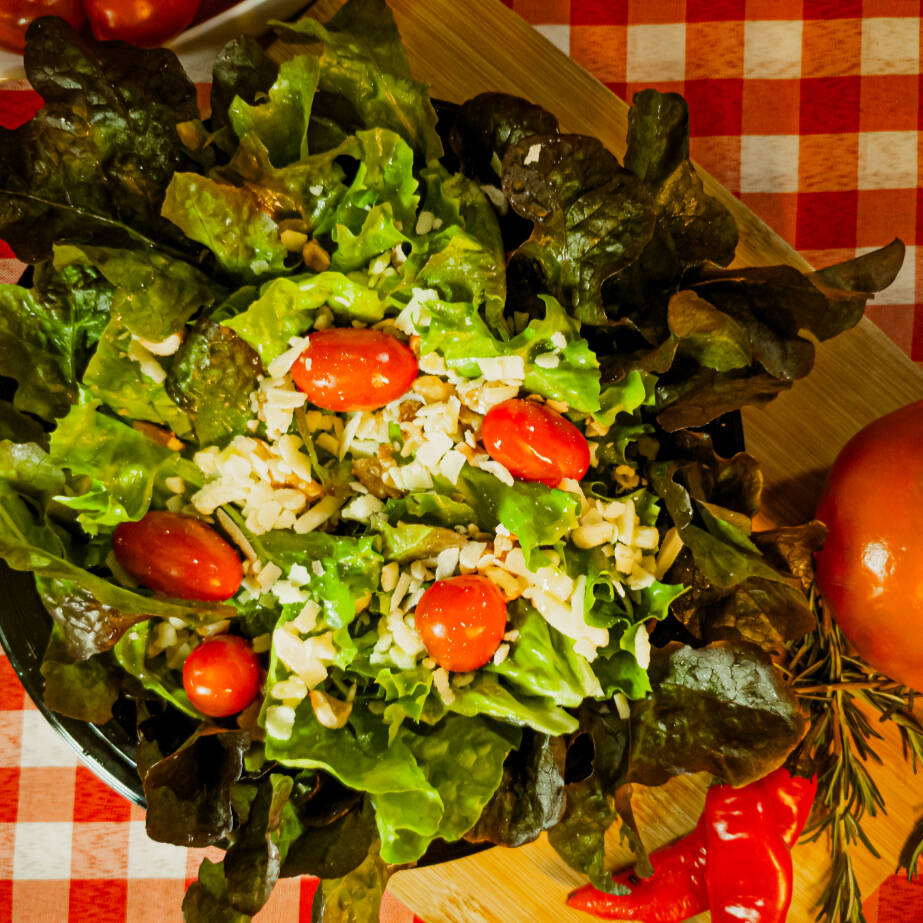 Folhas frescas selecionadas, tomate cereja, parmesão ralado, castanhas crocantes, acompanhadas do nosso molho especial feito pelo chef. Leve, saborosa e surpreendente.