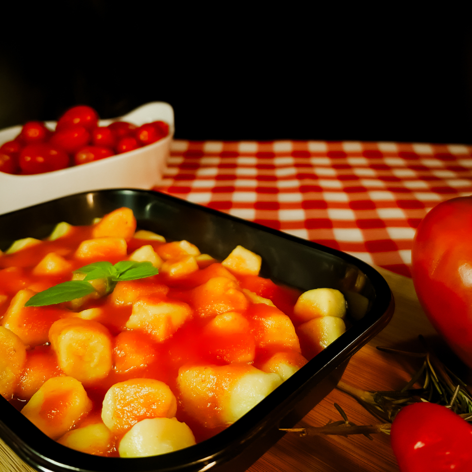 Nhoque artesanal de batata, macio e leve, servido com nosso molho sugo rústico, feito com tomates frescos e temperos na medida. Clássico e delicioso.