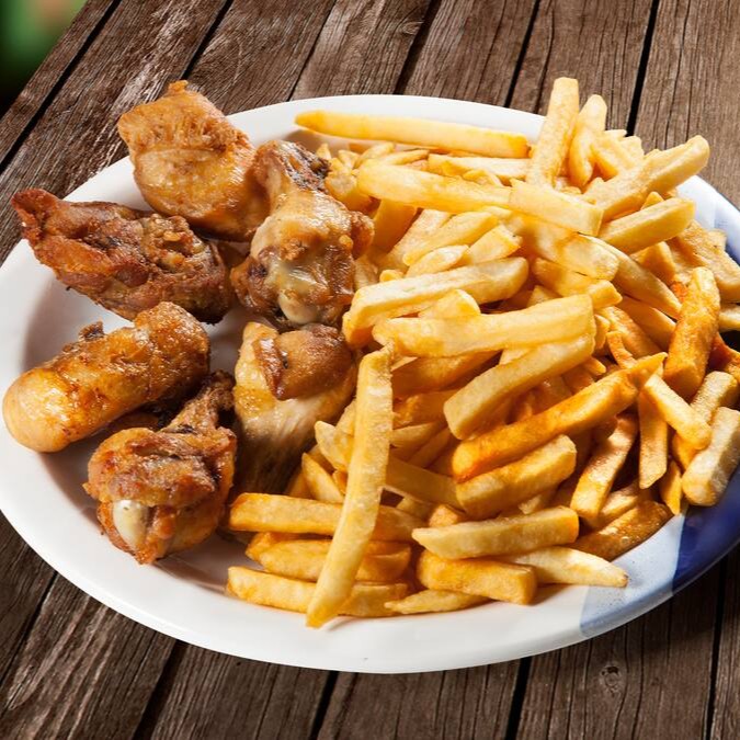 Meio frango a passarinho (apenas coxinha da asa), meio batata frita.