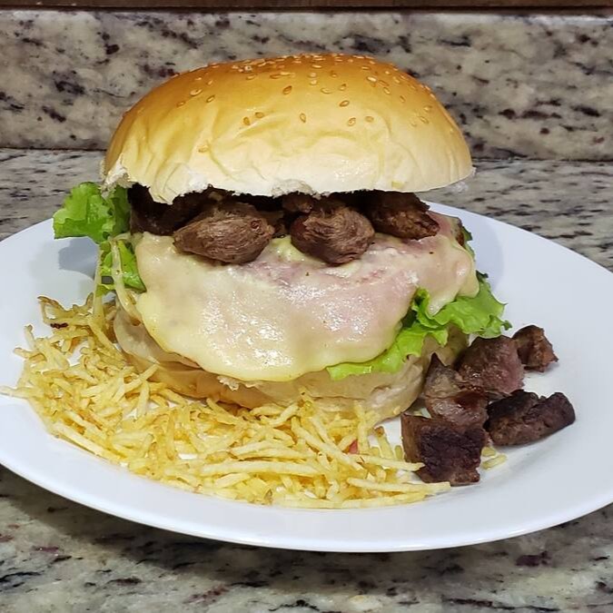 Pão, Hambúrguer 90g, Alcatra, Queijo, Presunto, Tomate, Alface, Batata Palha, Maionese da casa.