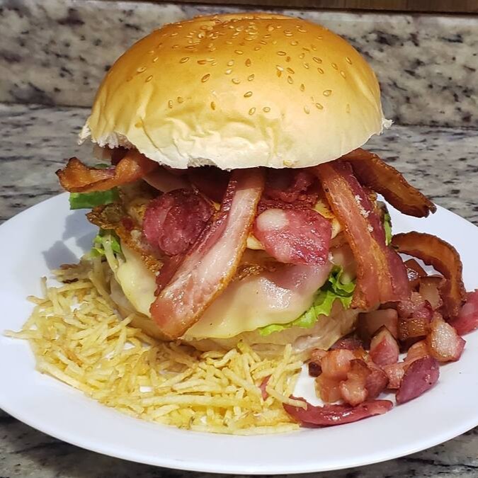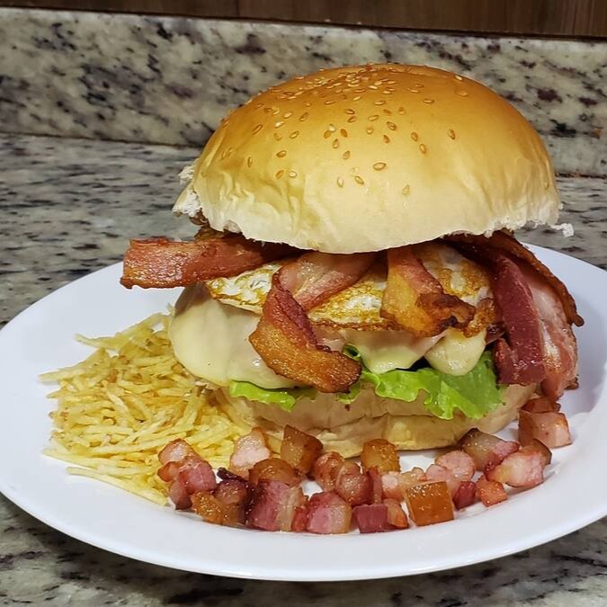 Pão, Hambúrguer 90g, Bacon em Fatias, Ovo, Queijo, Presunto, Tomate, Alface, Batata Palha, Maionese.