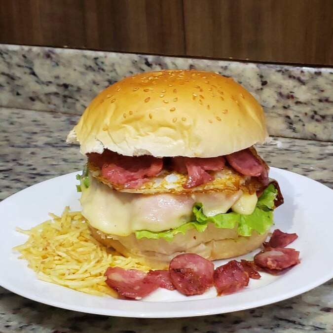 Pão, Hambúrguer 90g, Calabresa, Ovo, Queijo, Presunto, Tomate, Alface, Batata Palha, Maionese.