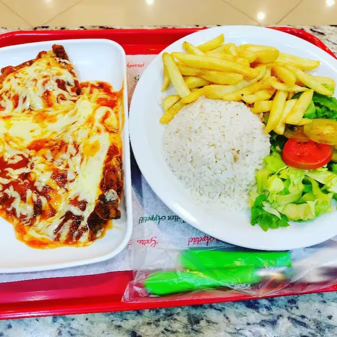 Arroz, Bife a parmegiana, Fritas.