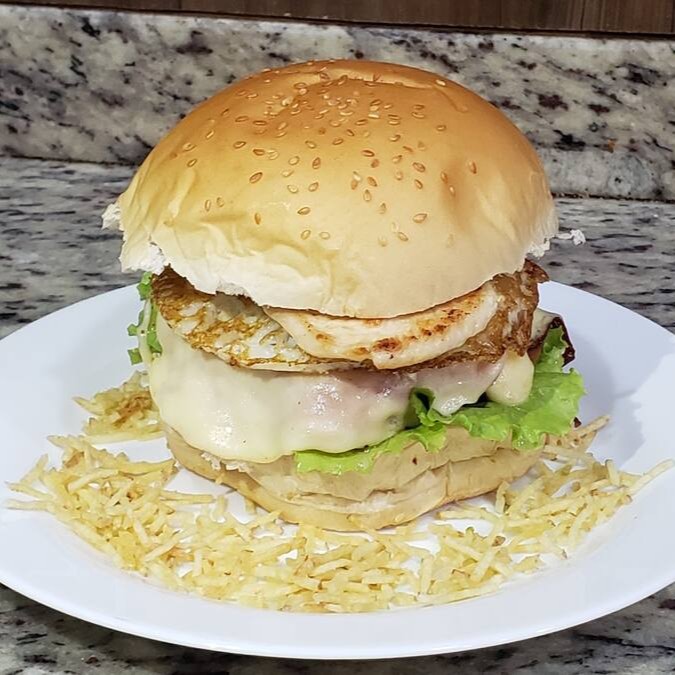 Pão, Hambúrguer 90g, Ovo, Queijo, Presunto, Tomate, Alface, Batata Palha, Maionese.