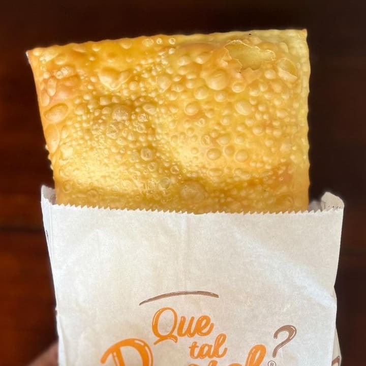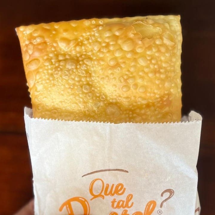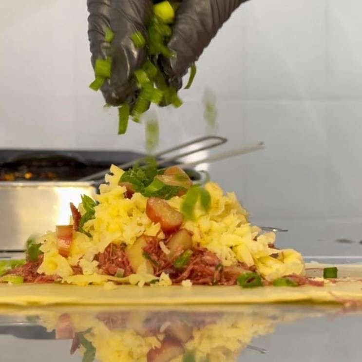 Banana picada, queijo, canela, açúcar e chocolate branco.