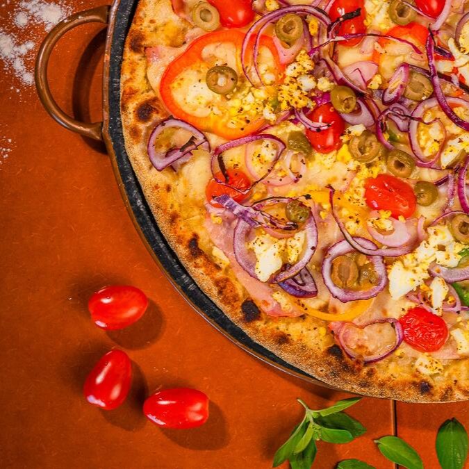 Nessa super promoção você leva nossa deliciosa Pizza contendo. Massa fresca, molho especial da casa, mussarela, presunto, tomate cereja selecionados, cebola roxa, pimentões colorido , ovos e azeitonas faiadas + (gratis) refri 600ml