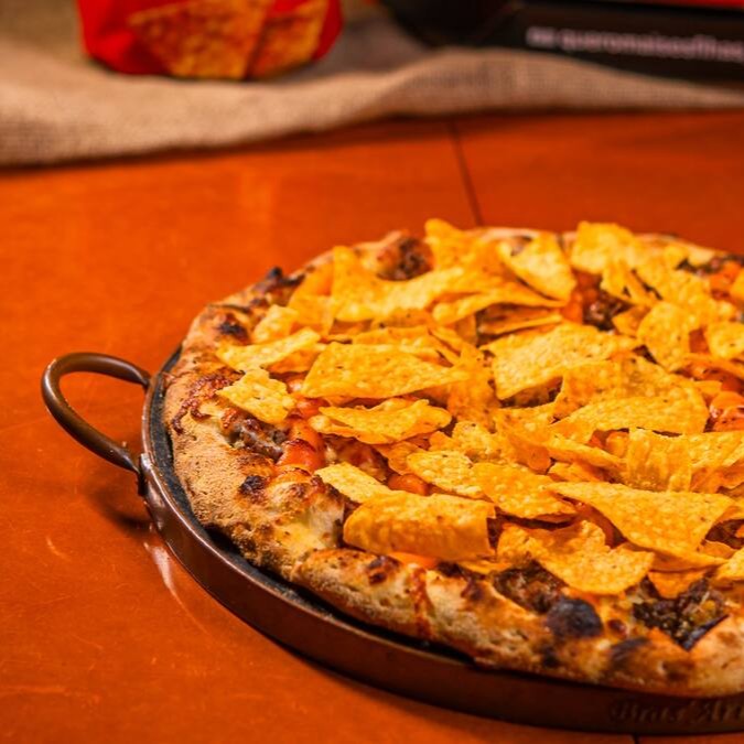 Massa fresca (artesanal), carne bolonhesa, mussarela e Doritos