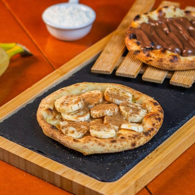Massa fresca (artesanal), banana, chocolate branco gratinado e canela
