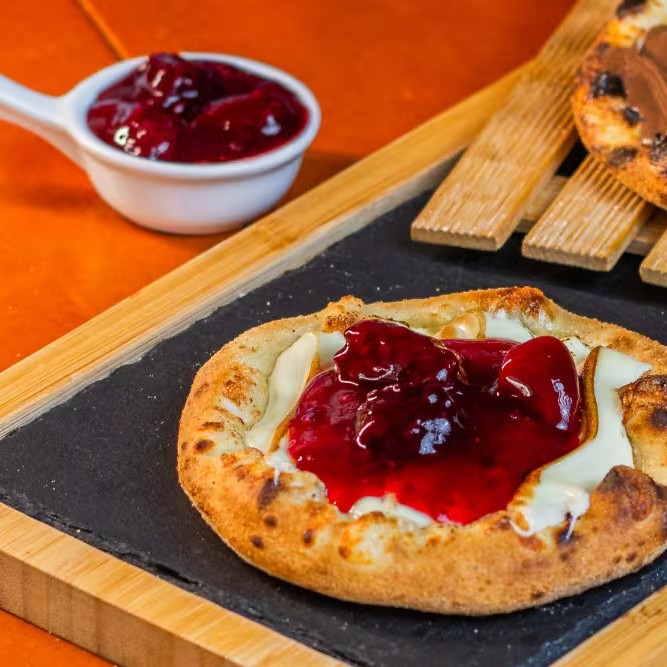 Massa fresca, base de mussarela, chocolate branco gratinado, cream cheese, e geleia de frutas vermelhas (sabe aquele sabor incrível, irresistível, entãooo.....)