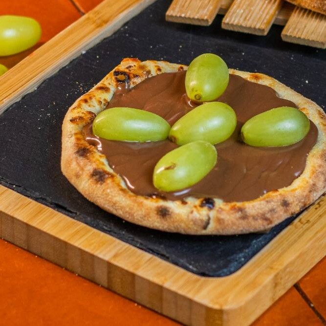 Massa fresca (artesanal), chocolate preto ou branco e uva
