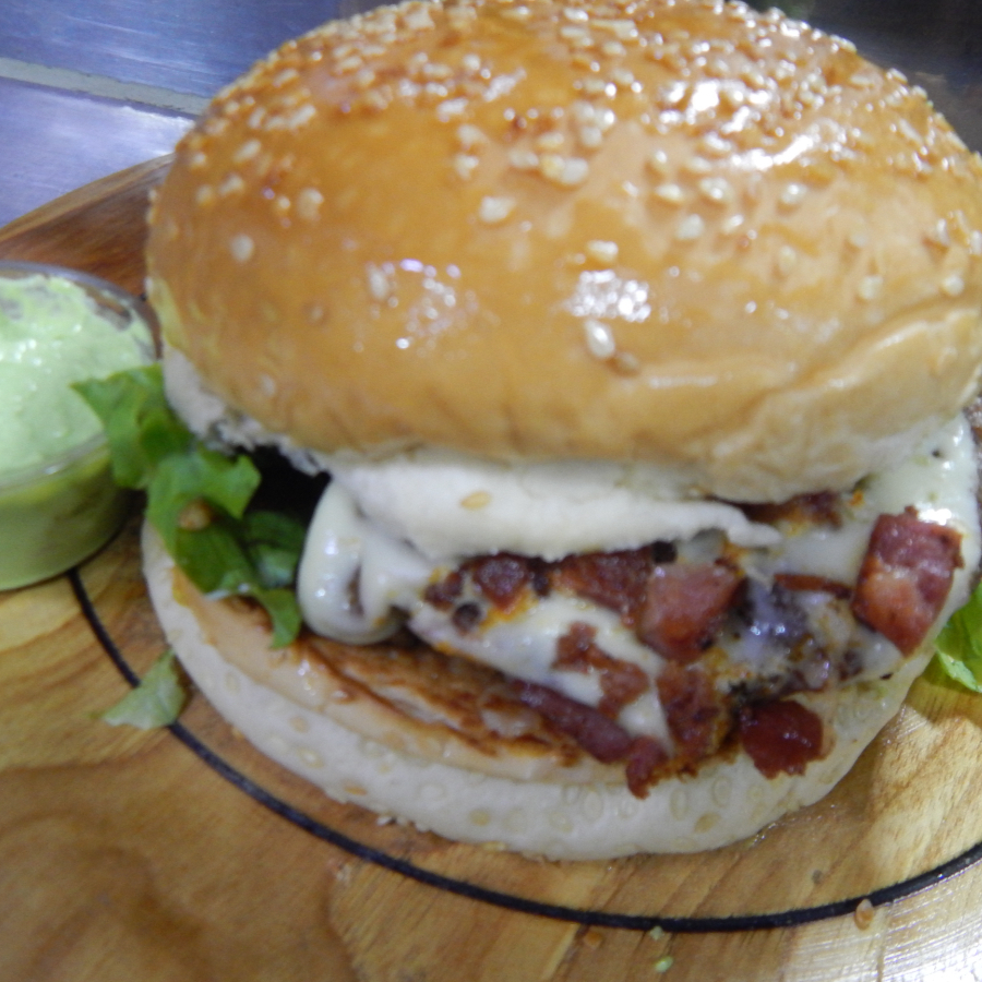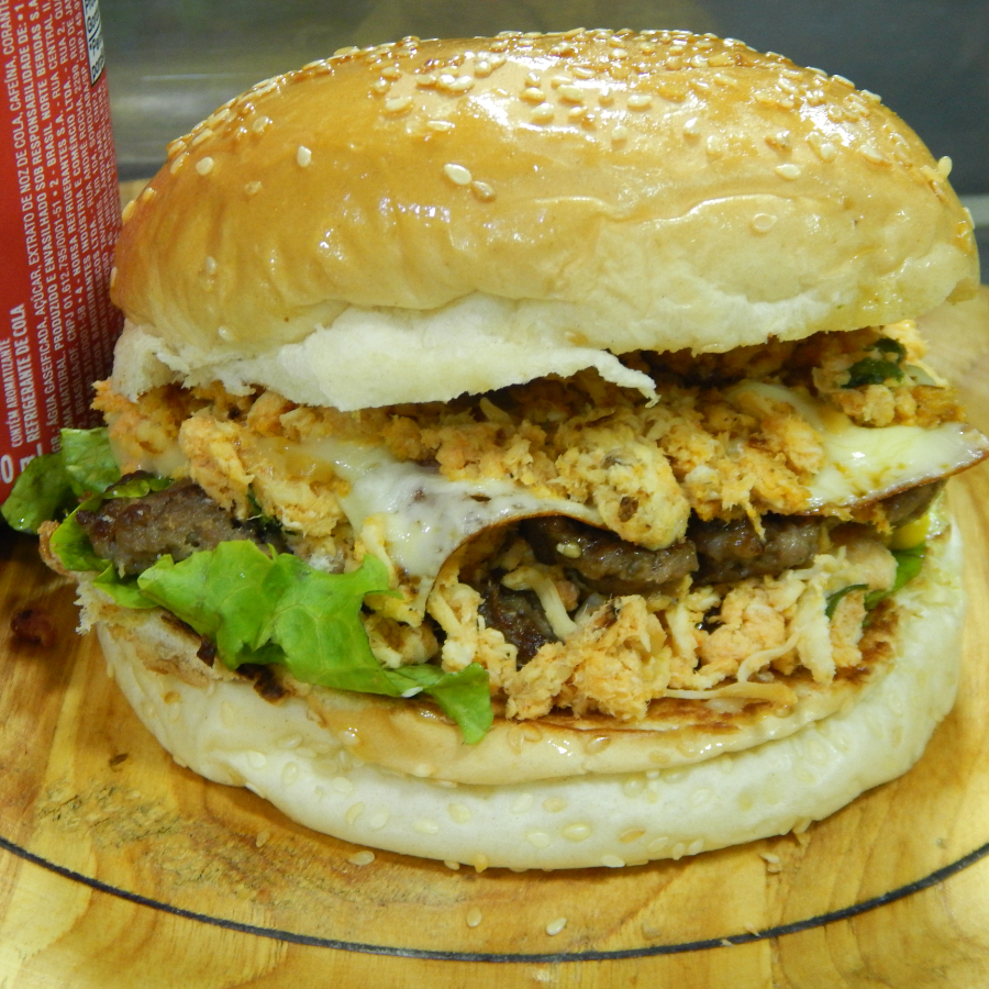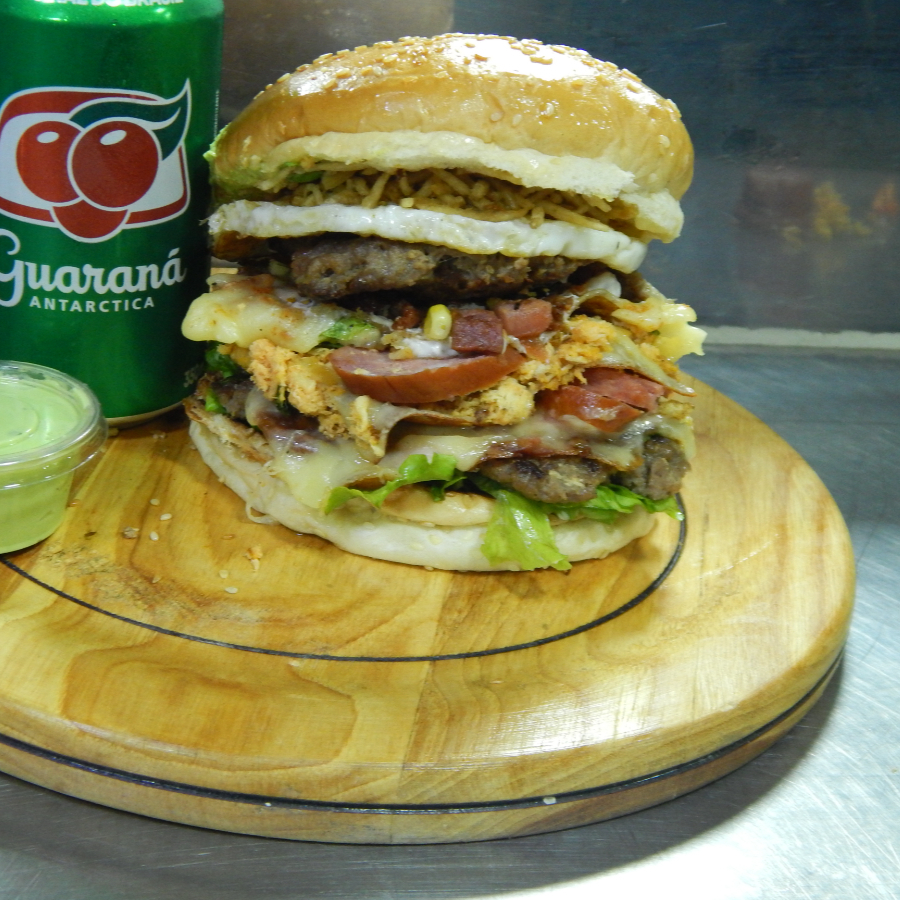 pão selado na chapa, maionese artesanal, alface, tomate, milho, molho especial, calabresa, bacon, frango desfiado, 2 hamburguer 70gr cada (fabricação própria) super suculento, queijo mussarela, presunto, batata palha.
