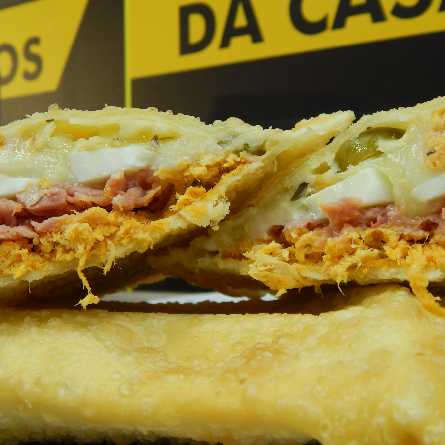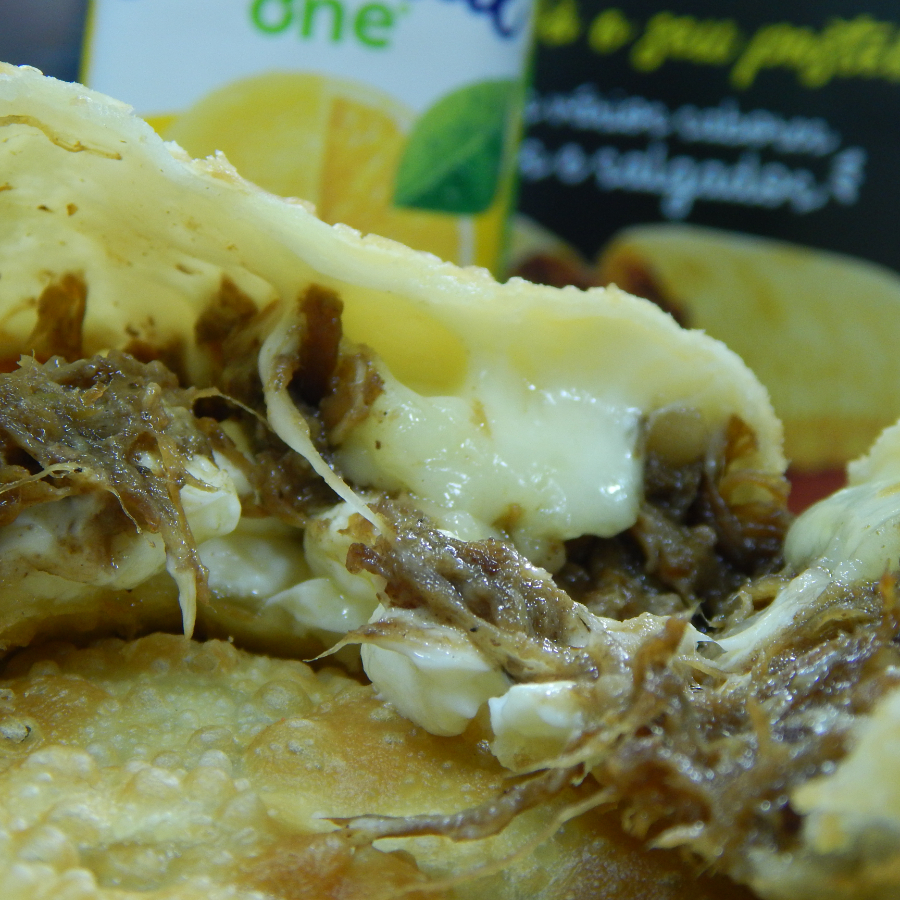 massa crocante sequinha, 15cm, recheada com carne moída temperada, cheddar.