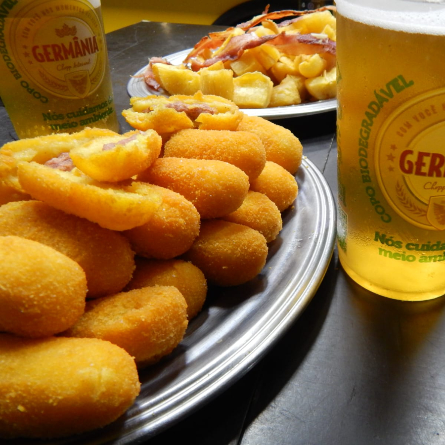 rolinhos de polenta recheada com linguiça fritas sob imersão, calabresa fatiada feita na chapa.