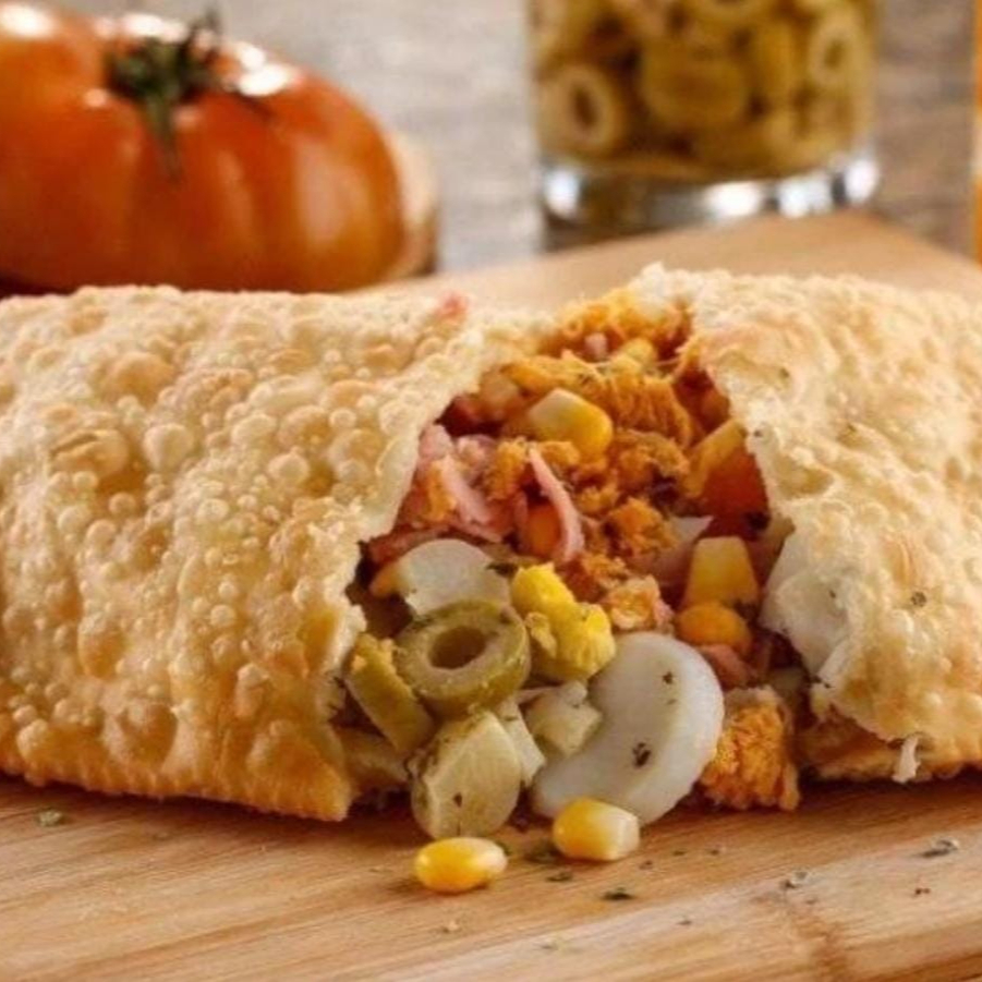 massa crocante sequinha 15cm, recheada com carne moída bovina temperada e queijo mussarela.