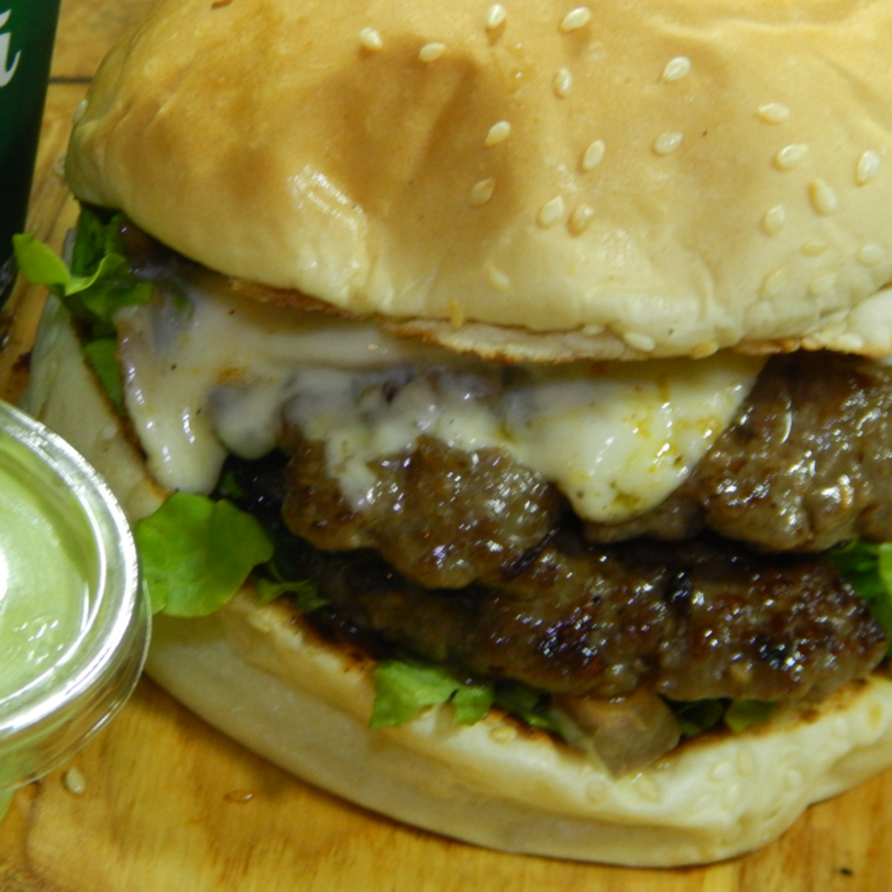 pão brioche selado na chapa, maionese, cheddar, 2 hamburguer 70gr cada (fraldinha), 2 cheddar fatia, barbecue.