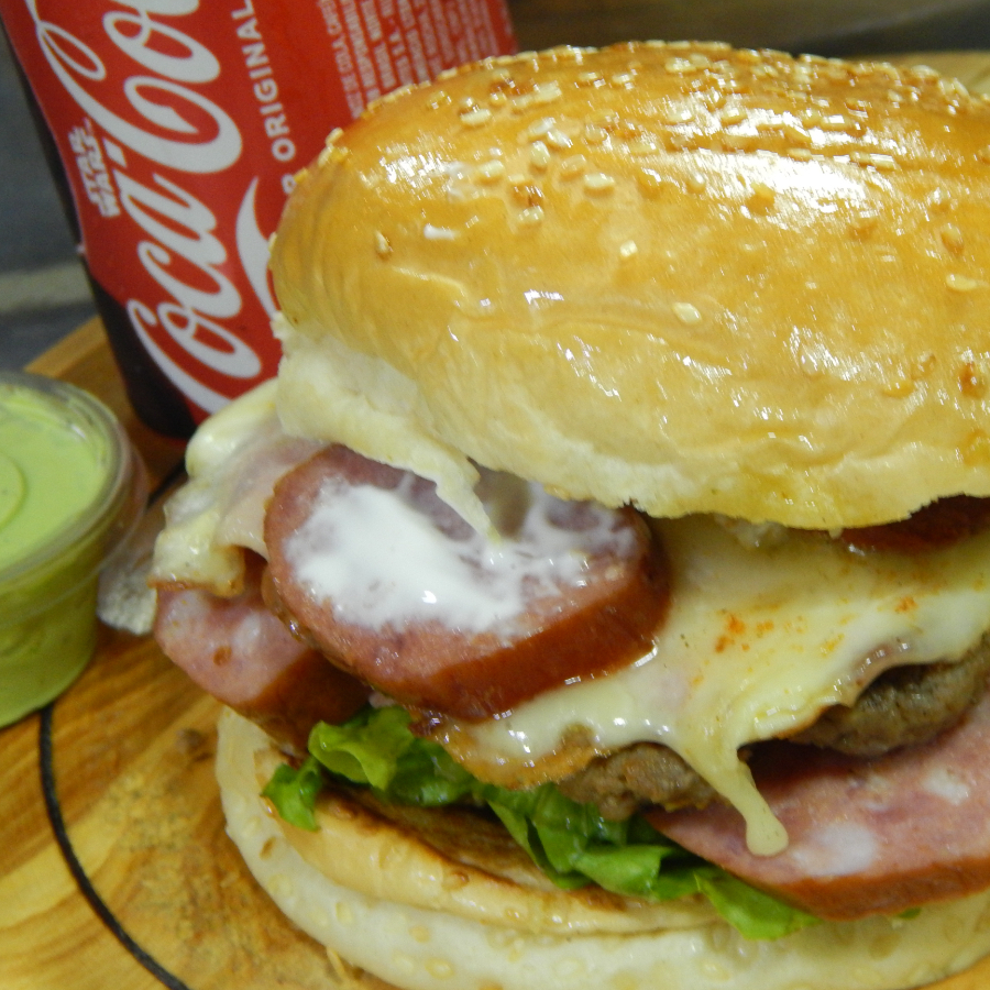 pão selado na chapa, maionese artesanal, alface, tomate, milho, molho especial, 2 hamburguer 70gr cada ( fabricação própria) super suculento, queijo mussarela, presunto.