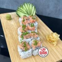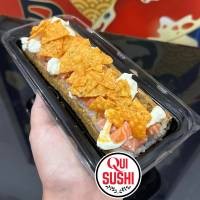 6 unidades - Salmão enrolado no arroz, coberto com cream cheese e doritos.